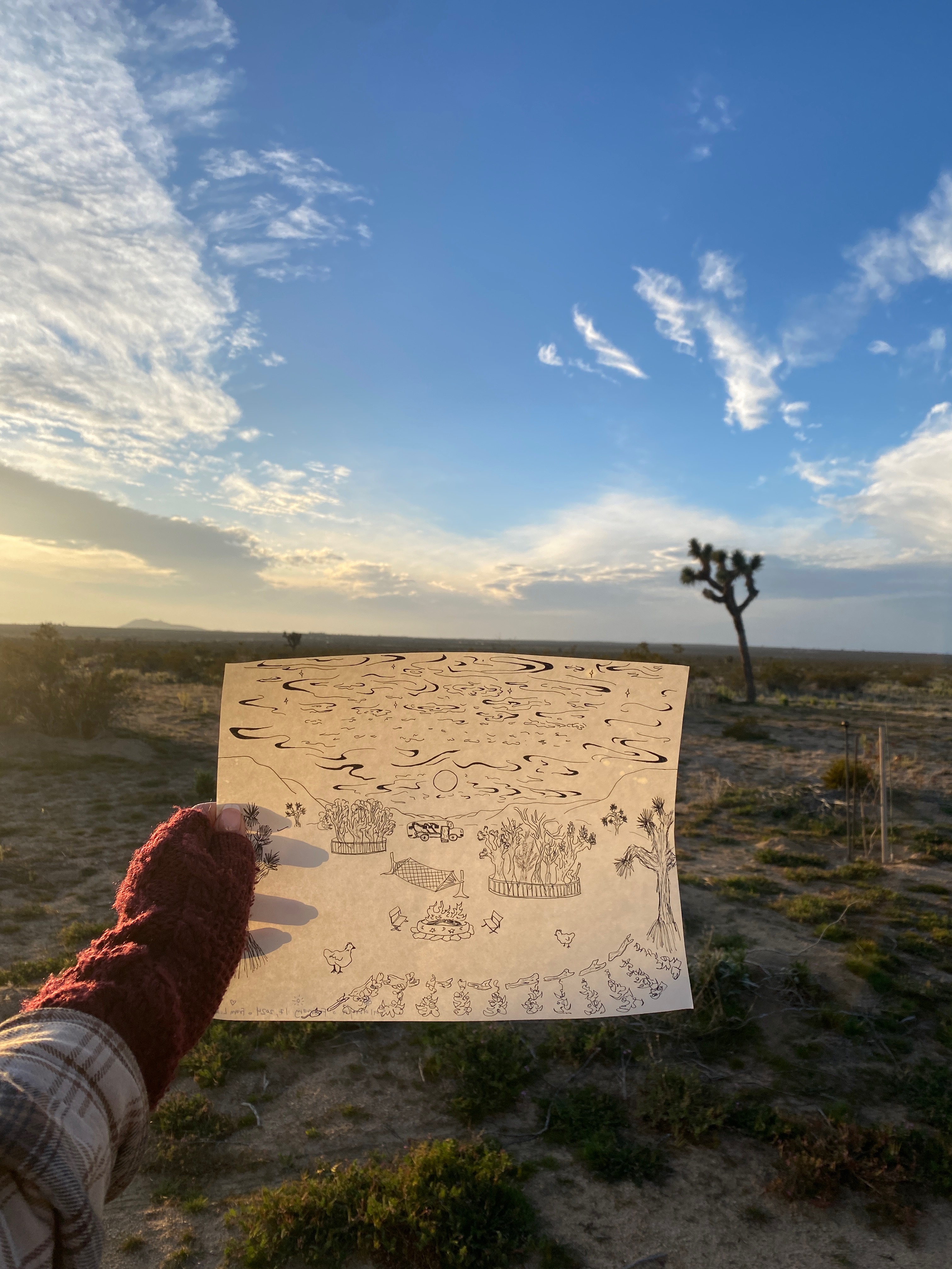 During her first stay at the land, Salanya and her best friend walked the earth, enjoyed a campfire, and had the chance to experience true silence as they gazed into a vivid starry night sky. They left beautiful illustrations, which are still framed on the Skoolie to this day: